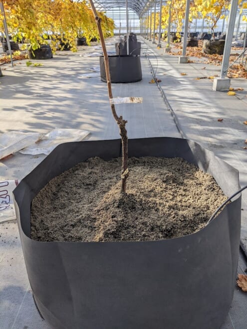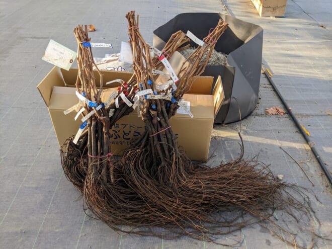 先日苗木が到着しました。植え付け前はしっかりと水分を吸わせてから植え付けします。春植え(3月頃)が理想かなと思いますがアスパラの作業と重なるので今回は12月に植え付けてしまいます。根域制限栽培であることと今回の苗木はハウス内で栽培なので水&寒さ対策は容易で乾燥や寒さでの枯れる恐れは低いと感じております。因みに、今回植え付けた苗木は2025年に収穫予定です。これで、ハウス内ではシャインマスカット80本とスカーレット20本、外の雨よけトンネルではシャインマスカット85本とスカーレット15本のぶどう達が揃いました。根域制限栽培では1本のぶどうの木に最大40房までしか実を付けないようにしております。根っこが限られているのでたくさん実を付けると負担が大きく品質低下や翌年に花が付かなかったり(実が取れない)する恐れがあるので無理はしません。そのかわり精鋭の40房を大切の管理して大粒のぶどうに仕上げていくのです。芽吹きまであと3か月、楽しみです。