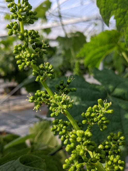 わかりにくいと思いますがコレがぶどうの花なのです。ぶどうになるのは先っぽ2センチ程あとはハサミで全部落としてしまいます。